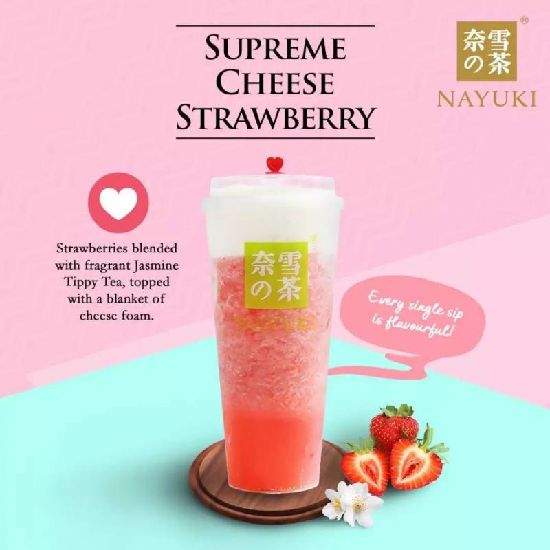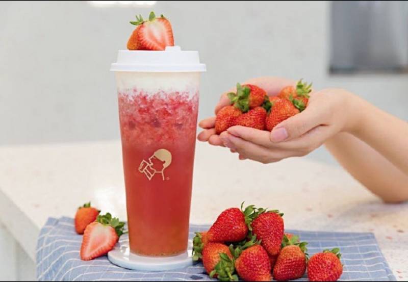 霸气芝士草莓也是人气饮品。将新鲜草莓榨汁后盖上一层芝士奶盖,芝士味不会过重,咸与甜之间的拿捏完美。值得一提的是,为了应付大量的生产需求,店家专门开辟了草莓果园,解决了草莓季节性的问题。