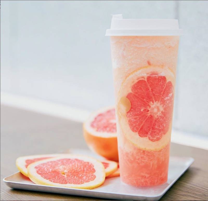 颜值最高的一款水果茶,切片后的南非葡萄柚贴在杯壁,果肉在茉莉茶中漂浮,中间的一层冰沙降低了葡萄柚自带的苦涩感,也突显出茶味。点正常的甜度就刚刚好。