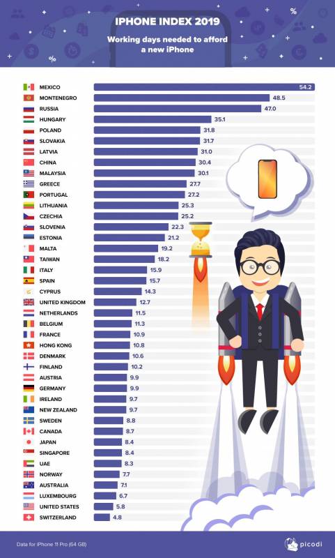 各国人民买一部iPhone 11需要工作多久?新加坡亮了
