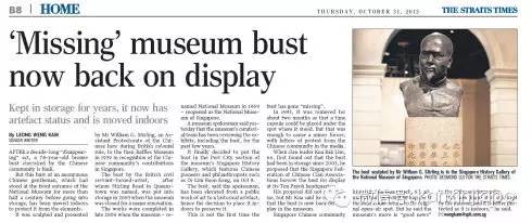 立于新加坡国家博物馆前超过半个世纪的华人铜像,在“失踪”10年后,2013年10月8日终于再度“现身”在馆内的“新加坡历史走廊”(见2013年10月31日(星期四)《海峡时报》新闻)。