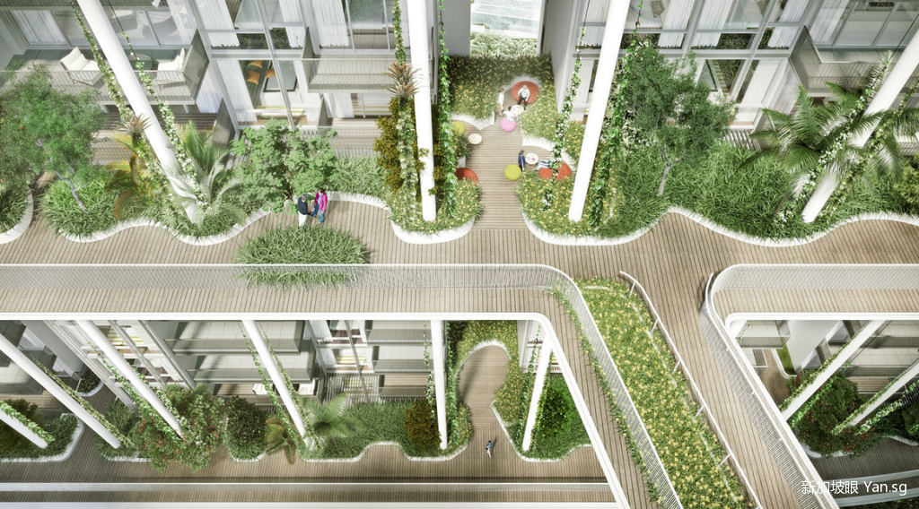 值得一提的,是项目的所有5个block都通过6楼和12楼的高空连道衔接起来,形成一个圆弧状的环型。这样的设计提供给居民独特的休闲体验和连成一体的社区感。在12楼的空中走廊散步几圈,将会成为绝佳的饭后休闲。