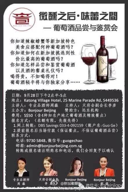 名媛俱乐部系列活动之葡萄酒品鉴会将于9月28日在Katong Village Hotel隆重登场!专业品酒师将与你独家分享葡萄酒佐餐,挑选,品鉴,礼仪秘辛。会后设有networking与精致餐点环节。报名详情见海报。