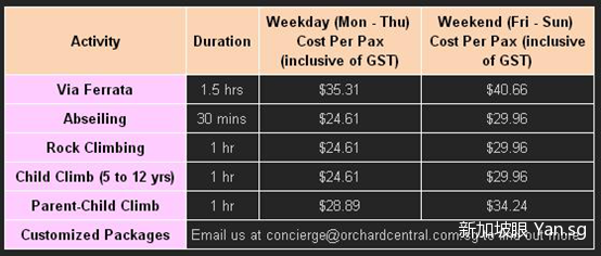 传统攀岩(Rock Climbing):周中24.61新币,周末29.96新币,时间1小时(一般人大概可以爬3趟)。