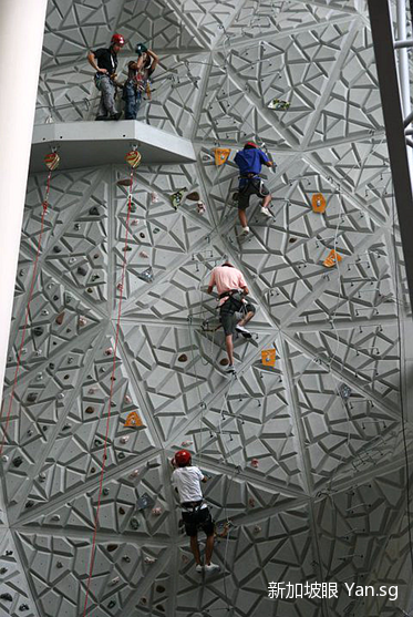 在人们的印象中,进行攀岩这项极限运动的场所通常都是在野外山崖或是专门的人工攀岩馆里。可是在新加坡最繁华的商业街——乌节路上的一家大型商场Orchard Central里,一面高达30米的商场墙壁整个变成了一块攀岩墙,可供游人进行攀爬。