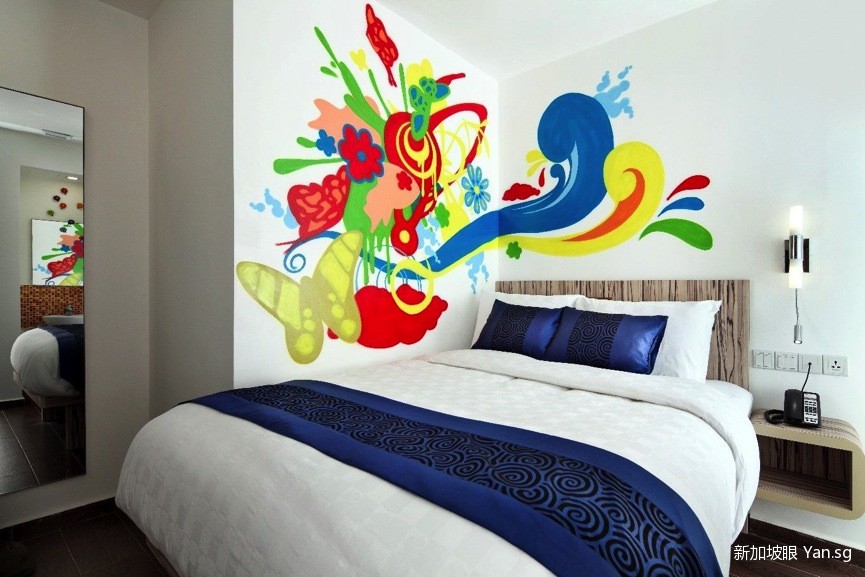 虽然说每间客房集合了本地艺术家的结晶画作。但最引人瞩目莫过于酒店后方一幅近四层楼高的瀑布画作。这是本地独立专业艺术家Ceno2的杰作,让这个座酒店外墙显得格外有生气。其独特的的艺术风格属于AerosolArt 也称为‘街头涂鸦艺术’,混合西方式艺术创作出现实主义、超现实和立体艺术(Realism, Surrealism 和Cubism)。