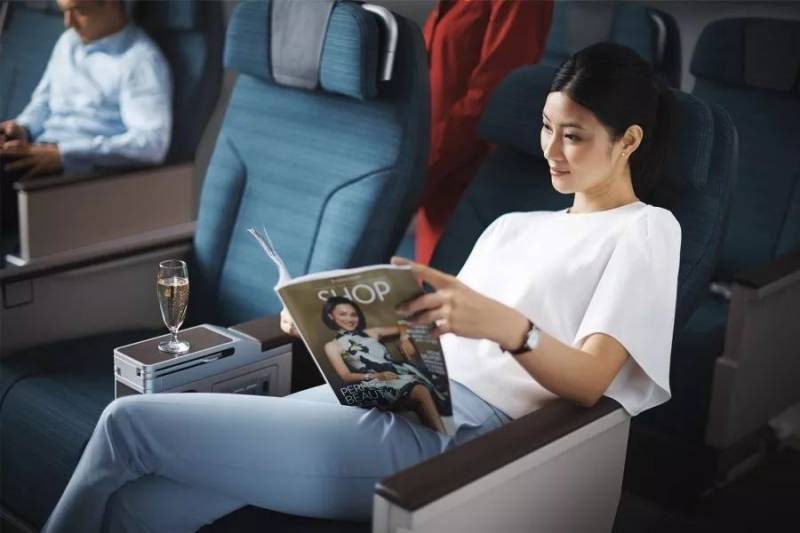 特选经济舱,环境幽静,而且配备了可伸直的脚垫,就连扶手也是可以收起的。座位倾斜角度增加,为乘客增加了前后距离。升级的娱乐系统为每个座位配备了更大的12.1寸屏幕,手机、平板电脑专用底座可以让电子设备固定于与视线高度水平的位置,非常舒适。