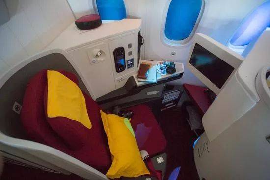 大陆唯一上榜航空公司,也是世界上成长最快的航空公司之一。今年更同时获得中国最佳商务舱的肯定呢!红色座椅,简约,腿部空间很大,完全躺平也没问题。