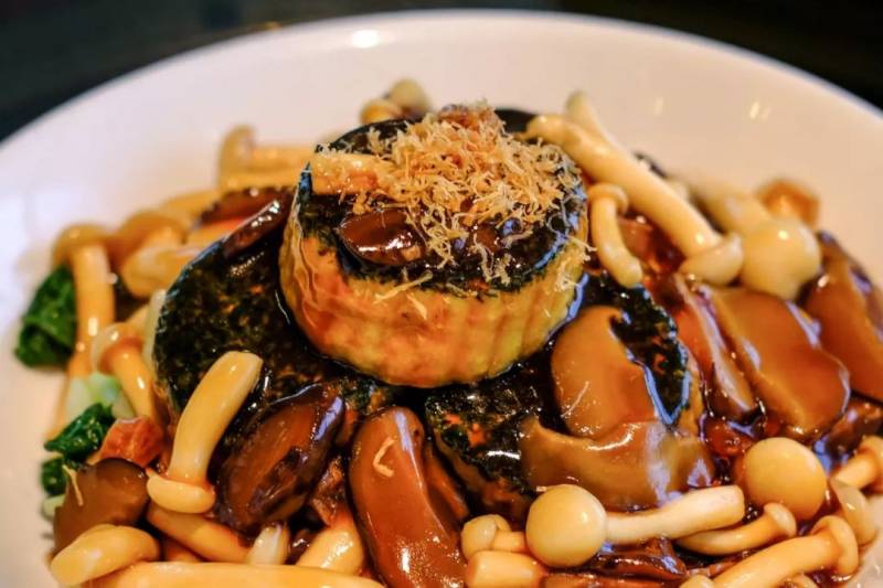 佐以青菜、蘑菇和瑶柱丝,单纯的质地,