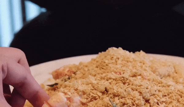 圆滚滚的虾盘成一圈,上面盖了厚厚一层麦片。
