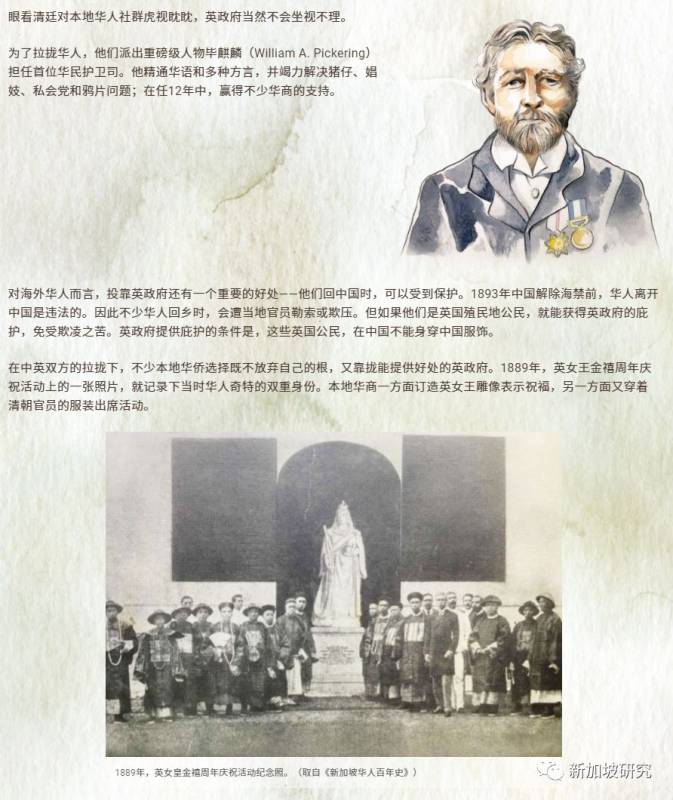 清廷有意夺取新加坡华人的经济和政治资本,英政府则不希望清廷的政治势力渗入本地。因此,中英双方各出奇招,致力赢得本地华人的效忠。中国领事馆积极举办文化和赈灾活动,也为清朝皇帝和皇太后庆祝寿辰。其中一项有趣的举措,是在本地售卖清朝官衔。1889年,《叻报》刊登一份清朝官衔价格表,里头共有47个官衔供选择。据统计,晚清时期新马一带共有295人拥有官衔,当中只有五人是因为科举或立功获得官衔,其他官衔都是买来的。