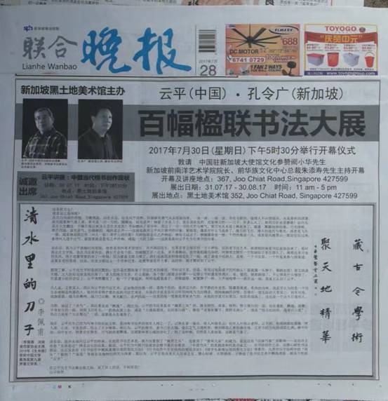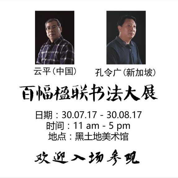 摘要: 云平、孔令广百副楹联书法大展将于7月30日下午5点在新加坡黑土地美术馆举办开幕仪式。