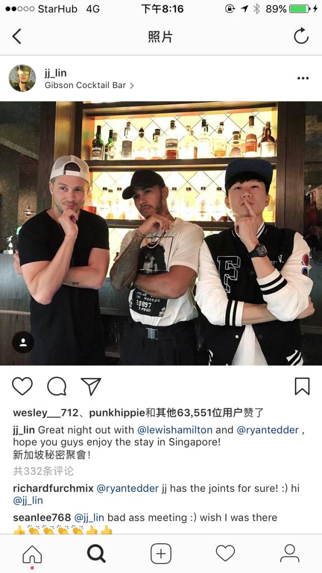 林俊杰最喜欢的车手,就是路易斯汉密尔顿(Lewis Hamilton),难怪Ryan Tedder在他的FB主页,投其所好称希望路易斯汉密尔顿和奔驰车队获奖。