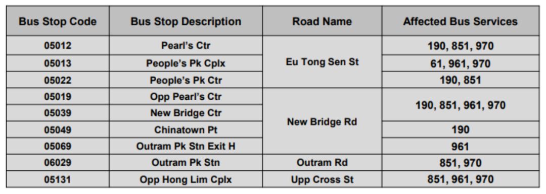 从2月15日傍晚5点到16日凌晨3点,以及2月25日下午2点到晚上11点59分,61号、190号、851号、961号和970号巴士都将暂时改道,避开余东璇街、新桥路、欧南路、克罗士路上段,不会在以下车站停站: