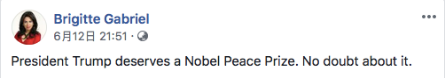 比如美国社会活动家Brigitte Gabriel认为:“特朗普应该得奖,毫无疑问。”