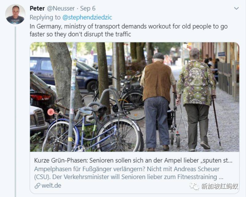 有网民指出,德国的做法恰恰与新加坡相反。德国交通部要求所有年长人士都必须积极锻炼,加快过马路的步伐,这样才不会干扰交通,让车子等人。