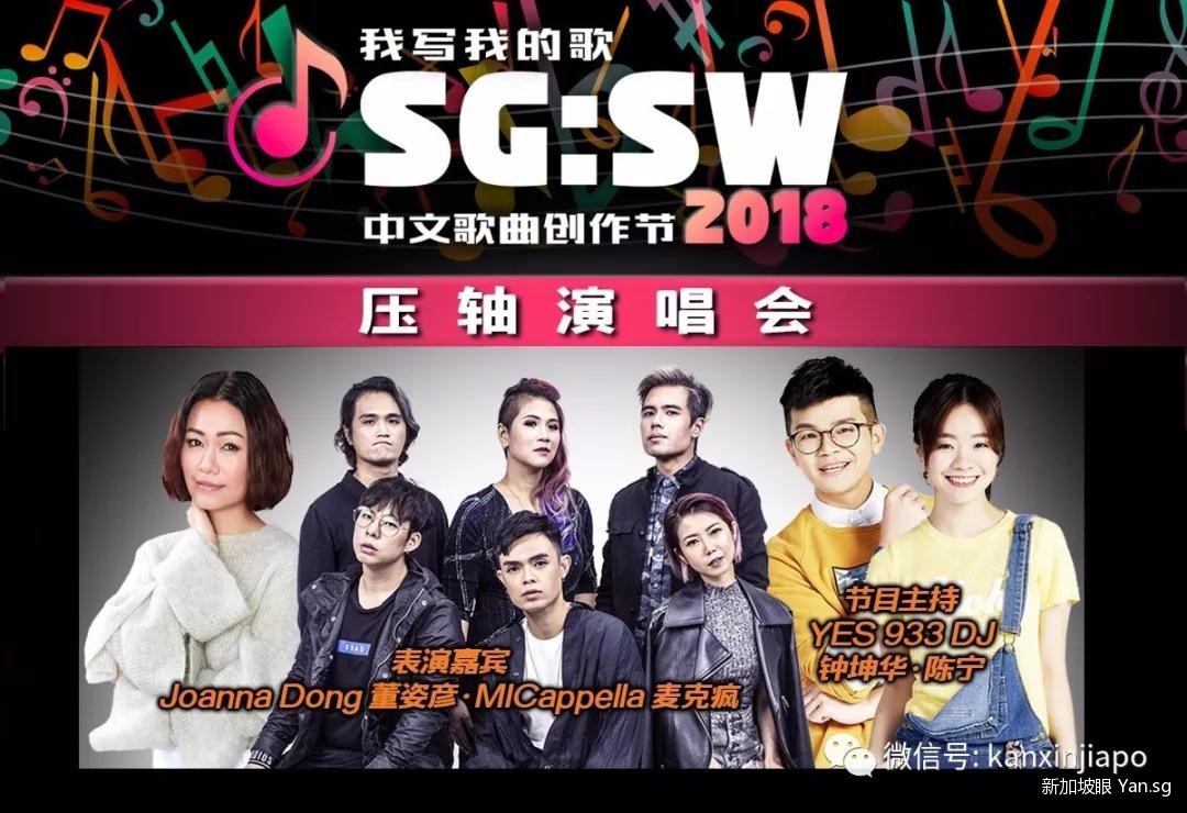 《SG:SW 2018 我写我的歌》是一个全国中文歌曲创作节,借此活动,希望能发掘更多本地音乐人才,并且逐渐培养属于当代的本地中文歌曲创作文化。今年的“压轴演唱会”节目除了有我们12首脱颖而出的作品呈现,还有新加坡新生代爵士歌手董姿彦和新加坡人声组合MICappella麦克疯担任特别表演嘉宾。
