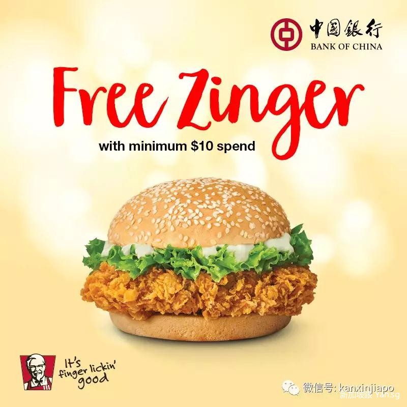 中银Visa信用卡付款时,每单满$10即可兑换免费的肯德基Zinger汉堡