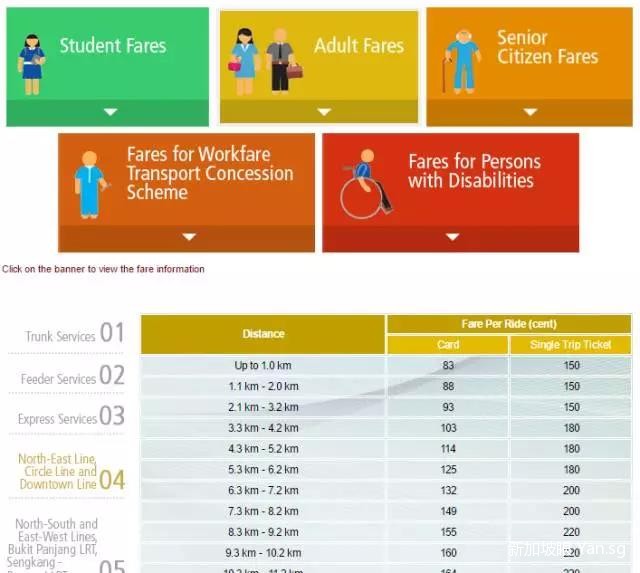 ▲(SMRT网站上地铁的收费概况:可以从最左边看到目前不同路线有不同的收费,不过都是以路程计算。)