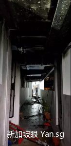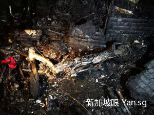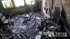 民防部消防员赶到后,在15分钟内扑灭了大火,组屋内的楼道已被烧得焦黑,现场一片狼藉,并有3人被紧急送医。