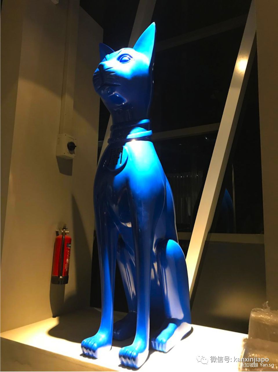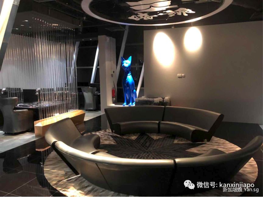 嚯!一进来就被大厅中间端坐着的一尊巨型蓝色猫雕像给镇住了!蓝色可是电竞的代表色啊,用这尊雕像做“镇咖之宝”,有品位。