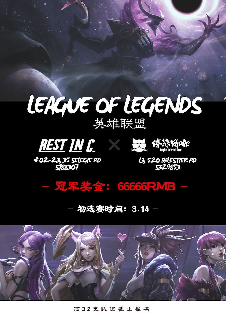 除此之外,热爱英雄联盟LOL的朋友可以踊跃参加由暗派和本地潮牌买手店Rest in C共同主办的大奖赛,冠军奖金足有66666人民币!!