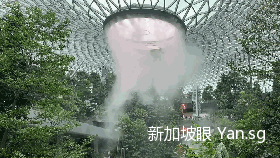 从天而降的瀑布,配合着由9000块玻璃,将近1万8000多个钢梁和6000多个钢节点组成的玻璃穹顶和沁人心脾的绿植……