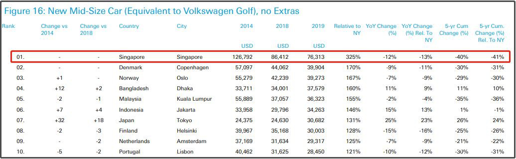 新加坡的大众高尔夫的价格终于在榜单上“脱颖而出”,成为全球最贵!平均76,313美金。别忘了,这个价钱还没加“天价”拥车证哦……呵呵哒……还不是因为新加坡汽车进口税高!