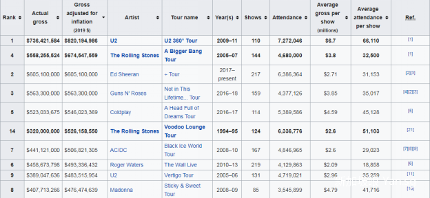 U2乐队2009年 – 2011年的360度巡演以7.36亿美元(通胀8.201亿美元;约合11.24亿新币,56.8亿人民币)创下了吉尼斯世界纪录!!!