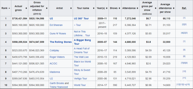 ▲史上10大票房最高的巡演记录(实际数字,未经通胀调整)