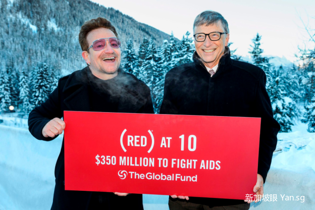 ▲Bono与微软总裁和创办人比尔盖茨会面,捐助3.5亿美元对抗全球艾滋病