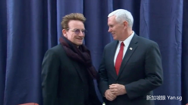 ▲Bono在德国慕尼黑与美国现任副总统麦克彭斯会面交谈(2017年)