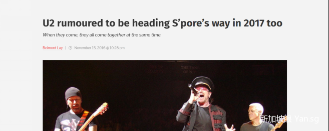 关于U2要来新加坡巡演的消息,其实早在2016年11月就有相关的传闻了。在Coldplay公布了2017年亚洲巡演场次的日期后,新加坡本地网络媒体Mothership透露了内部知情人士的传言称U2将在2017年年底将《Experience + Innocence》巡演带到大洋洲和亚洲等国家;并且正与新加坡体育城探讨预定国家体育场场馆作为该巡演的其中场次之一。