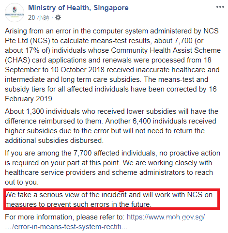 昨天(2月16日),新加坡卫生部发表文告称,将不会追讨因新加坡社保援助计划(CHAS)系统失误造成的超额津贴。但他们会在合约范围内,向系统承包商–国家电脑系统(NCS)私人有限公司追责,追回事故造成的损失。