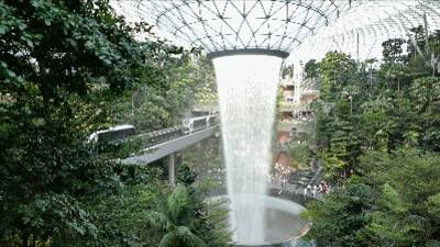 一只脚刚踏进星耀樟宜就听见水声,往前一看,非常没见过世面地“哇!!!”了一声。迎面就是一座巨大的瀑布,巨大的水幕从天而降,激起细密的水雾。周围是繁茂葱绿的绿植森林,看起来如梦似幻,心旷神怡。