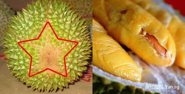 猫山王是目前新加坡最受欢迎的榴梿,你永远猜不中它到底是苦的,甜的,还是有苦有甜的~ 真正的猫山王接缝处有类似星型图案。