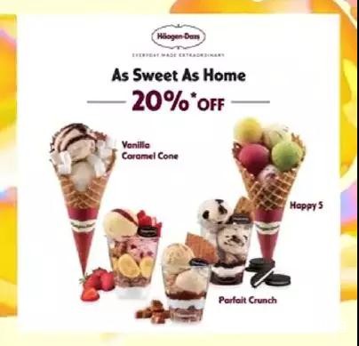 哈根达斯限时优惠来了,任意五种口味的冰淇淋打折扣20%,吃货们还不约起来。