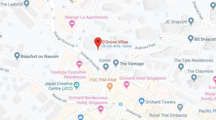 迪林别墅位于乌节路地段柑林路(Orange Grove Road),这里毗邻阿摩园 (Ardmore Park), 是新加坡第十区十分罕见的永久地契项目。迪林别墅占地50,400平方英尺,被规划为住宅用地,容积率为2.8。