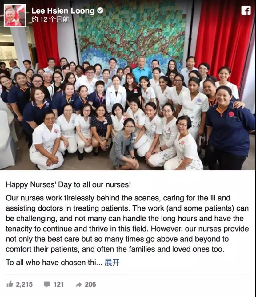 2017年8月1日护士节,新加坡总理李显龙也在脸书上发文,表示对护士的慰问。