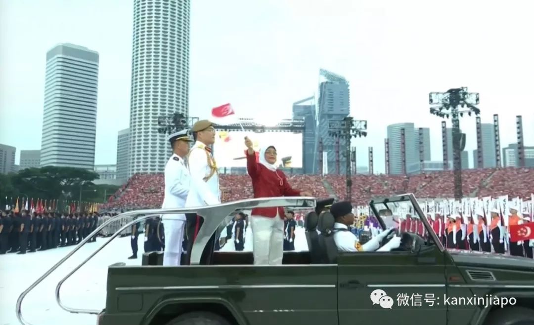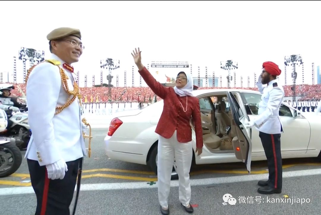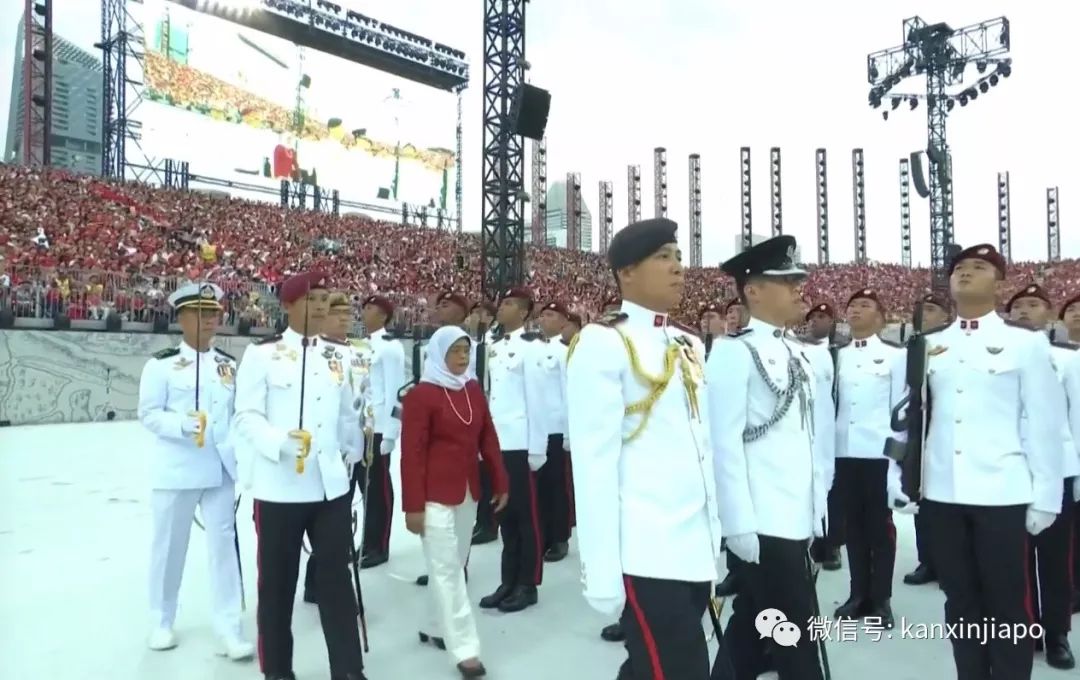 38支接受检阅的队伍就位。哈莉玛总统随后到场,她是新加坡第一位女总统,这是她自2017年九月上任以来,第二次以国家元首身份,参加国庆庆典。