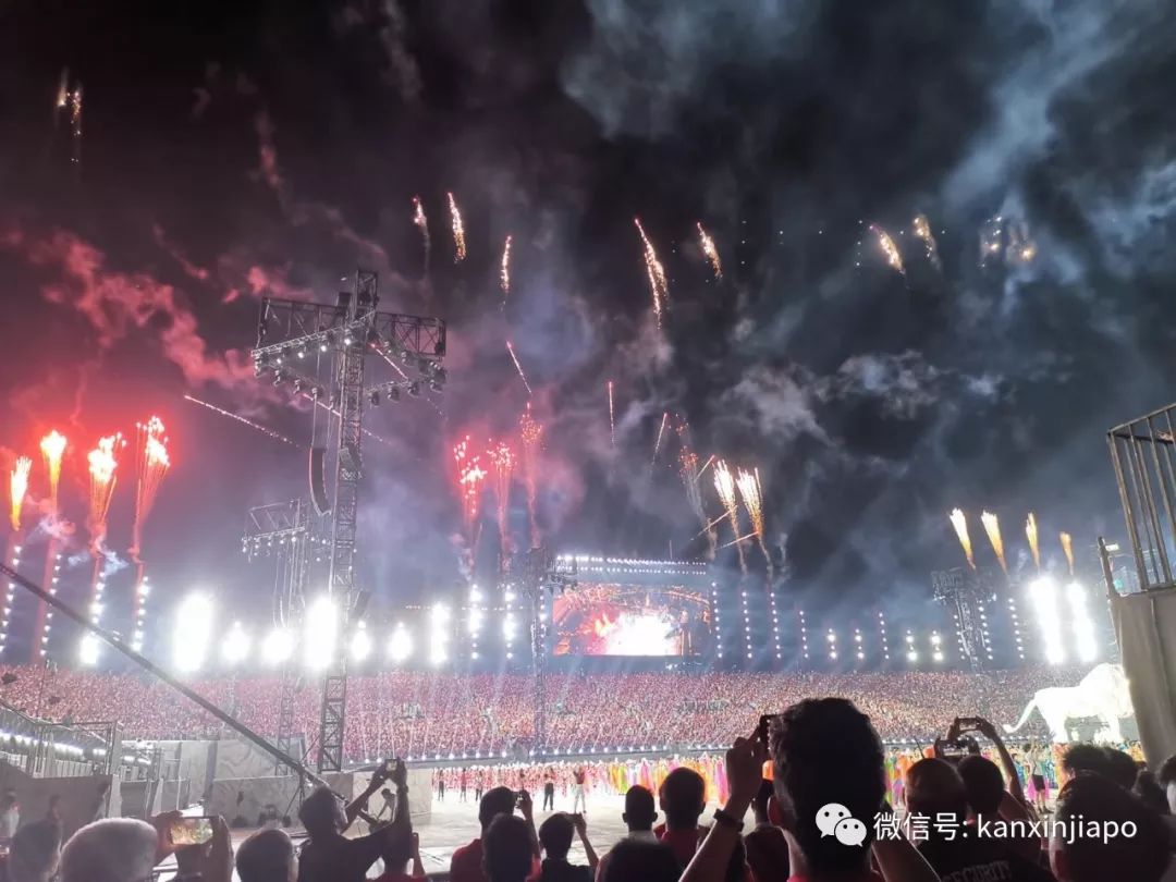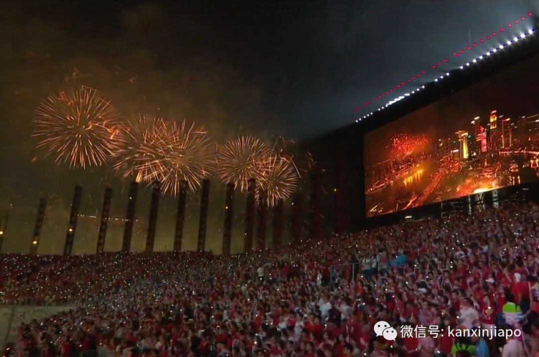 在念过新加坡誓约后,全场合唱新加坡国歌。但今年的国歌与以往不同,新加坡马来乐坛“摇滚之父”蓝利沙立(Ramli Sarip)的带领下,大家听到了完全另一种风格的国歌。国庆庆典每年的重头戏之一当然少不了boom shakalaka的烟花啦~