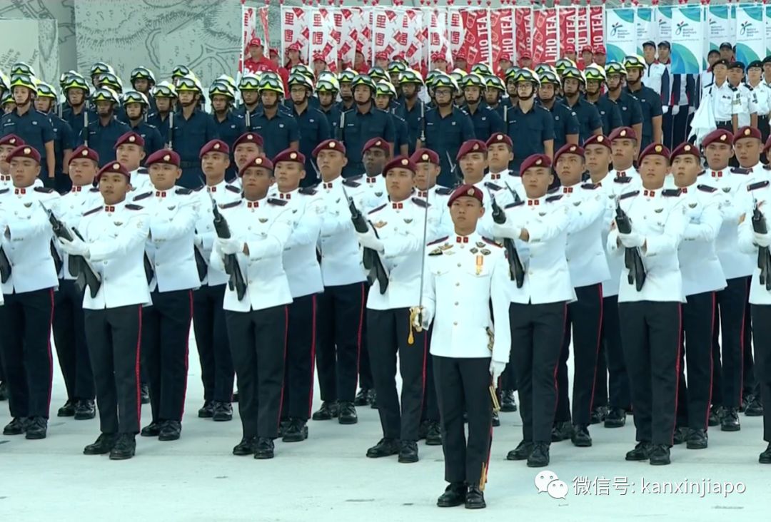 列兵方阵中不仅有新加坡陆军成员(绿色军装)、海军成员(浅蓝色军装)、空军成员(蓝白色军装)、警察部队成员(深蓝色军装)、民防部队成员(藏青色军装戴白色头盔),还有新加坡志愿军团的军人。