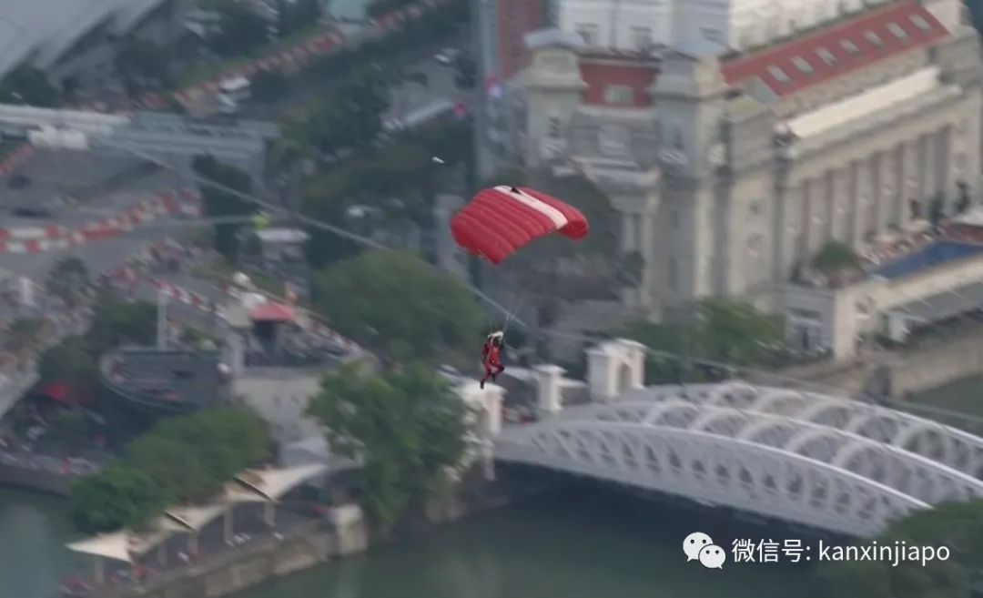 政府大厦周围有很多高楼建筑,这无疑对跳伞造成了很大困难。今年的所有跳伞员全部安全着陆,现场瞬间被点燃。