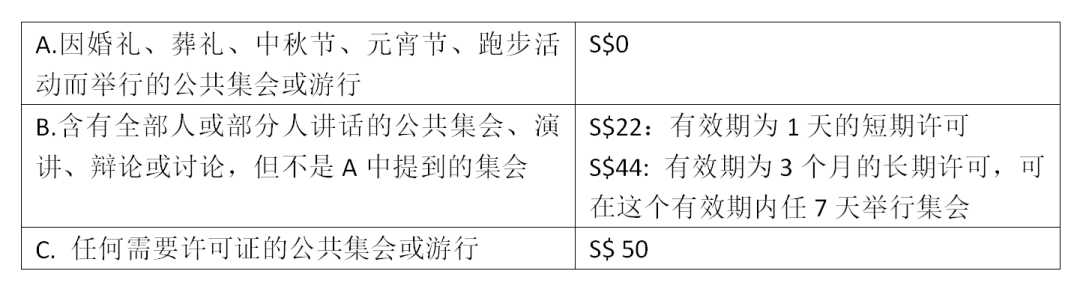 我们概念中的公共集会或游行的申请费是50新币;一些特殊的公共集会或游行,如因婚礼、葬礼、中秋节、元宵节、跑步活动而举行的活动,则不需交申请费。