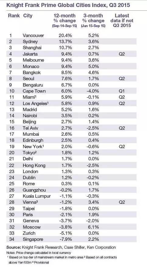 今年第三季度,豪宅指数涨得最快的城市是:莫斯科(6.1%) 、温哥华(5.2%)、摩洛哥(5.0%)、曼谷(4.6%)、墨尔本(3.6%)、悉尼(3.6%)、上海(2.7%)。