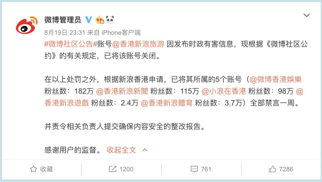 与此同时,新浪微博也以“发布时政有害信息”为由,关闭了一个名为 @香港新浪旅游 的账号。并将其所属的5个账号全都禁言一个星期。