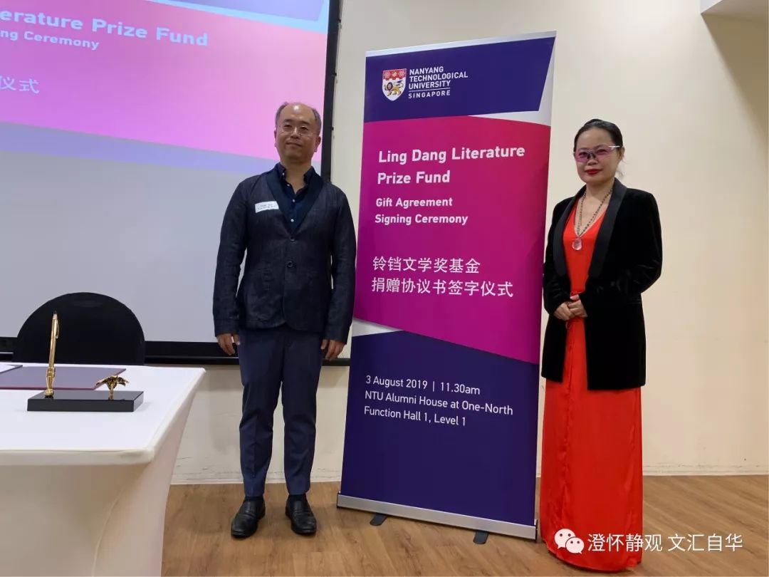 2019年8月3日,在新加坡举国欢渡国庆的喜时,铃铛文学奖基金捐赠仪式,在南洋理工大学纬一校区简朴举行。出席签约与见证仪式的有南洋理工大学副校长陈金樑教授,铃铛文学奖基金捐赠者一一南洋理工大学商学院校友、校友成就奖得主孙侠博士,南大中文系主任、华裔馆馆长游俊豪教授,校友事务处孙明炎主任、汤明辉主任和新加坡作家协会理事郭永秀和秘书穆军女士,南洋国际俱乐部校友等数十人出席。陈金樑副校长首先致辞。他高度赞赏孙侠博士对南大的贡献和对新加坡华语文学的奉献,为孙侠博士的激情与奋斗所感动!