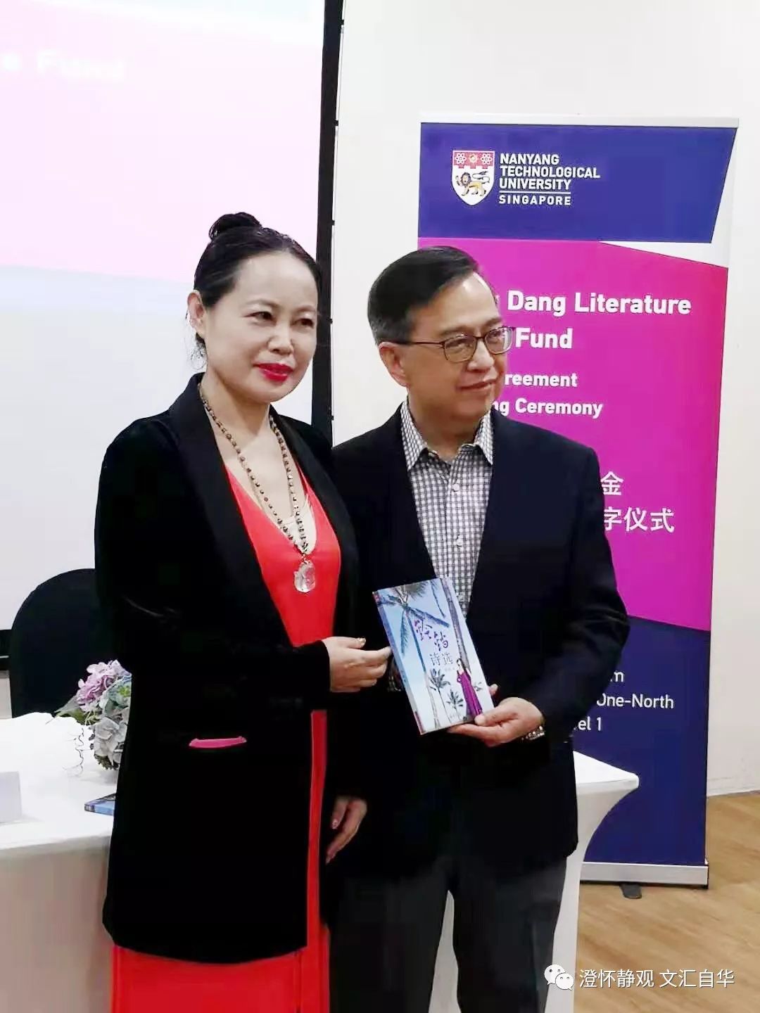 游俊豪教授首先肯定了孙侠博士的善举和对东南亚华语文学未来不可估量的意义!他的致辞颇具幽默感。他讲述了两个小故事:一是多年前有一个小女孩儿获省政府文学奖,派出著名诗人、评论家下去寻找小女孩儿,终于在一个偏远的油田里,找到了这位年轻的获奖者,这个女孩住在荒野的木板房里,经常被吊车搬来搬去。于是评论接踵而至:唱着爱情的歌谣、图腾:生命与文化的雕铸等等。二是小女孩后来成为中国作家协会最年轻的会员,她的状态又极为特别。一方面经商做油田,另一方面写作,于是北京媒体发表了“商人的白天与诗人的夜晚”之著名文章,多家转载,一时轰动。之后由陈金樑副校长和孙侠博士举行了签字仪式,鲜花盛开,共贺未来!