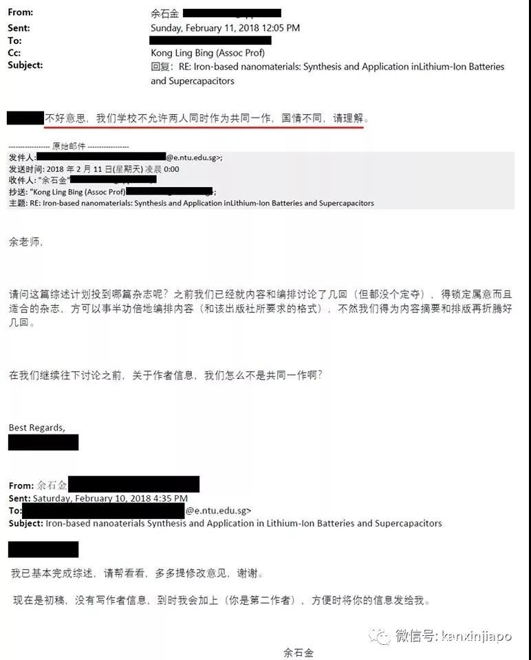 黄铭鸿说均为第一作者是之前以口头承诺达成的共识,没想到2月10号,余石金教授私发电邮说合写的综述把他列为第二作者,与最初答应的不同。