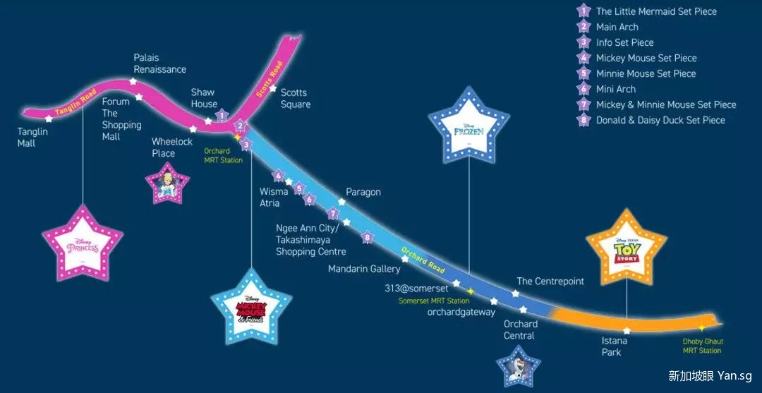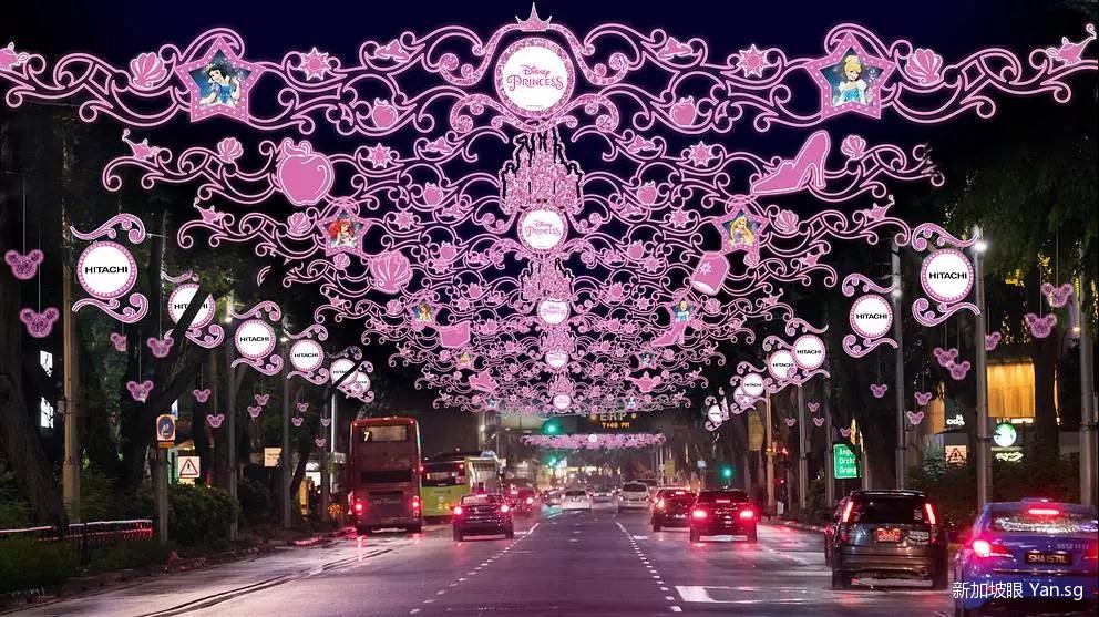 首先,从东陵路(Tanglin Road) 到 史各士路(Scotts Road)是迪士尼公主系列。在这一段路,将会出现传统的迪士尼公主形象,对,就是灰姑娘、白雪公主她们!就连灯饰都粉粉的,少女心十足~