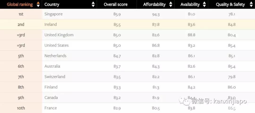它通过各个国家的可负担性(Affordability)、可得性(Availability)和质量与安全(Quality and Safety)三个指标综合衡量。以下就是今年的榜单前十: